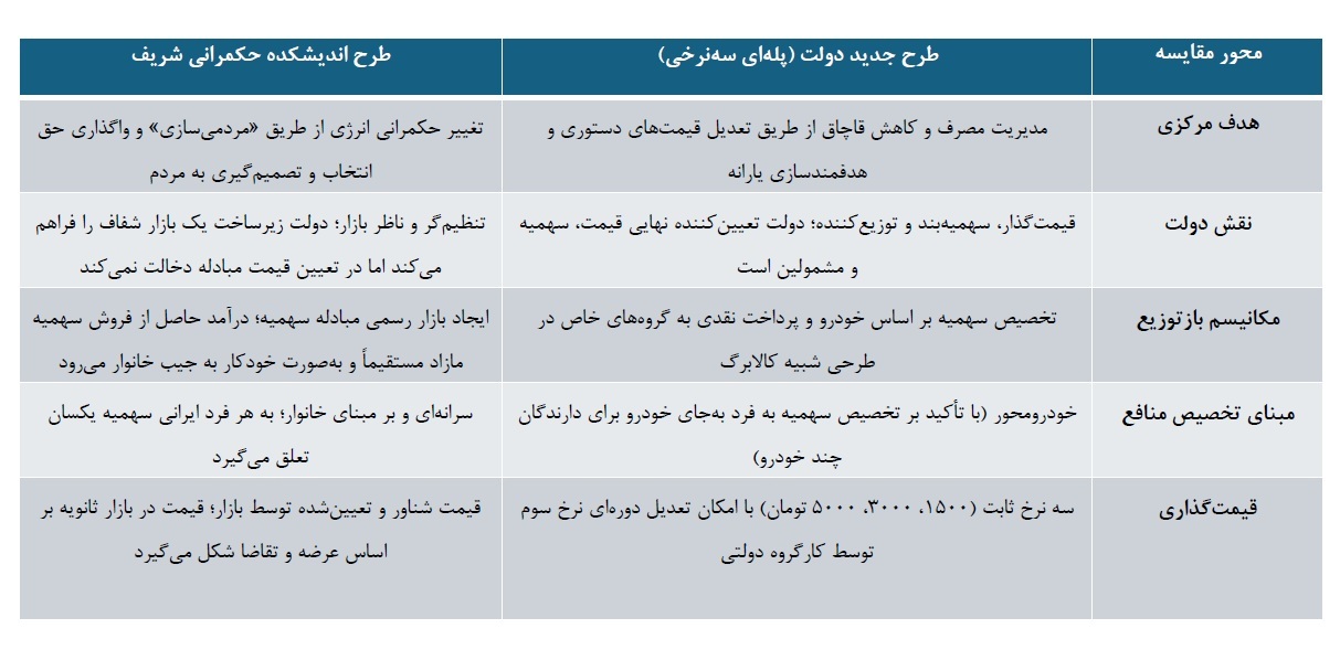 این طرح، اجراشدهی ایدههای محوری طرح اندیشکده نیست. روح حاکم بر طرح پیشنهادی مذکور، که همانا واگذاری حق انتخاب به مردم، خلق دارایی ملموس برای خانوار، و تبدیل دولت از بازیگر اصلی به ناظر بیطرف است، در طرح جدید مشاهده نمیشود. بنابراین، میتوان نتیجه گرفت که این دو، دو راهبرد متمایز و حتی جایگزین برای مواجهه با مسئله یارانه بنزین هستند، و طرح کنونی دولت، مسیری متفاوت از مسیر پیشنهادی اندیشکده شریف را طی میکند.